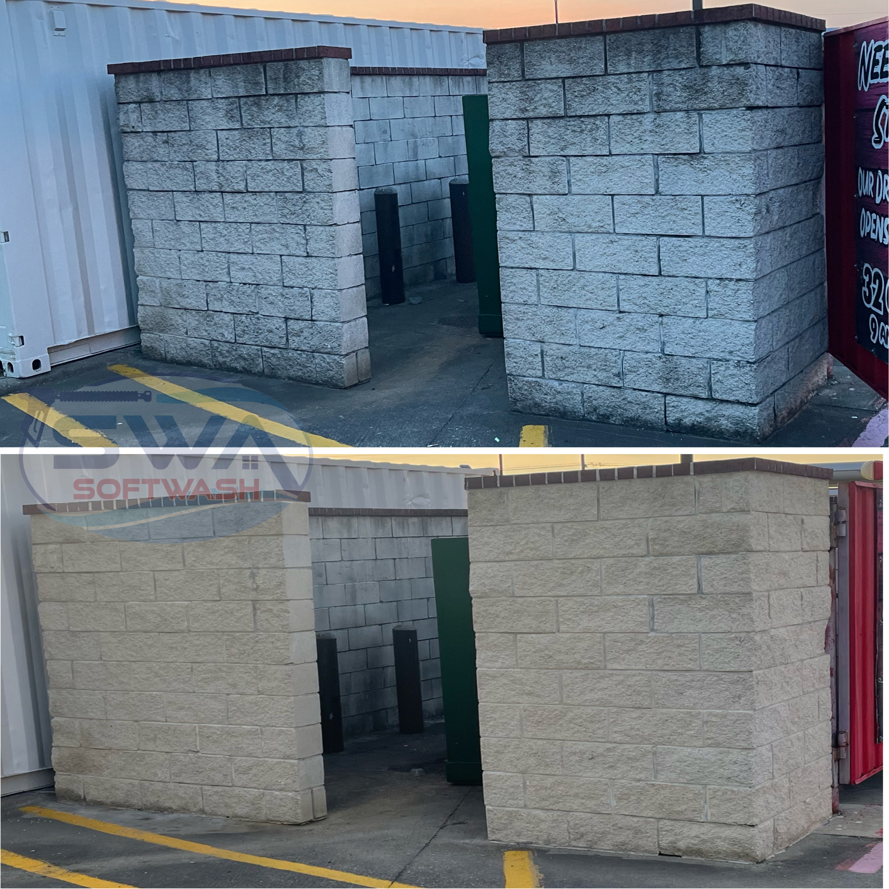 For this project, we performed a building washing to get rid of the organic growth (black streaks) from this building and the dumpster pad wall! We also surface cleaned the front patio.